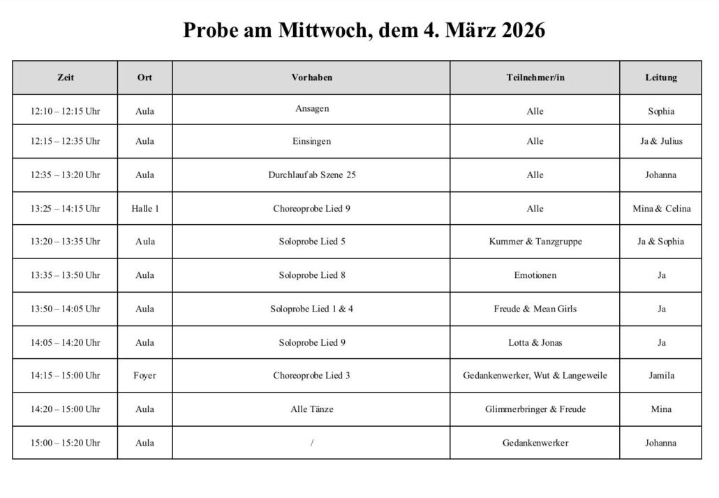 Wir starten nun mit den Generalproben. Das heißt, dass die Proben NICHT mehr nur bis 18 Uhr gehen, sondern bis wir fertig sind. !ACHTUNG! Es gab einige Änderungen im Organisatorischen Rahmen, bitte genau anschauen